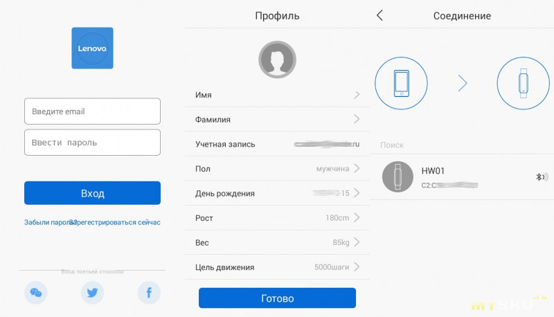 При первом запуске необходимо создать свой аккаунт для хранения собираемых данных, затем ввести информацию о себе и выполнить сопряжение смартфона с браслетом.
