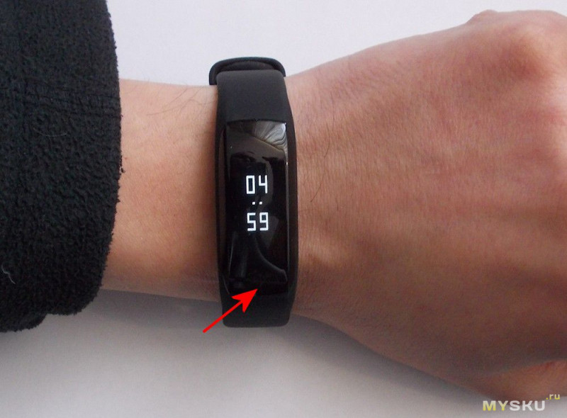 Управление браслетом осуществляется сенсорной кнопкой, находящейся с края дисплея. Место кнопки помечено кружочком. Так как он неразличим на фото, я указал его положение стрелкой.