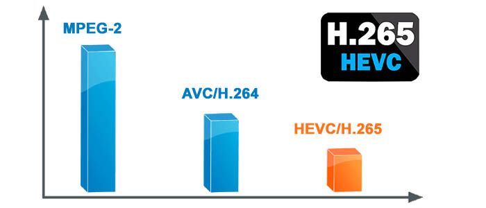 Кодек H.265 сжимает информацию более эффективно, чем H.264, в результате чего файлы сравнимого качества видео имеют вдвое меньший размер.