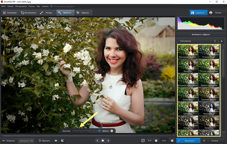 - инструмент «Кисть», который применяет эффекты к отдельным объектам на фото;