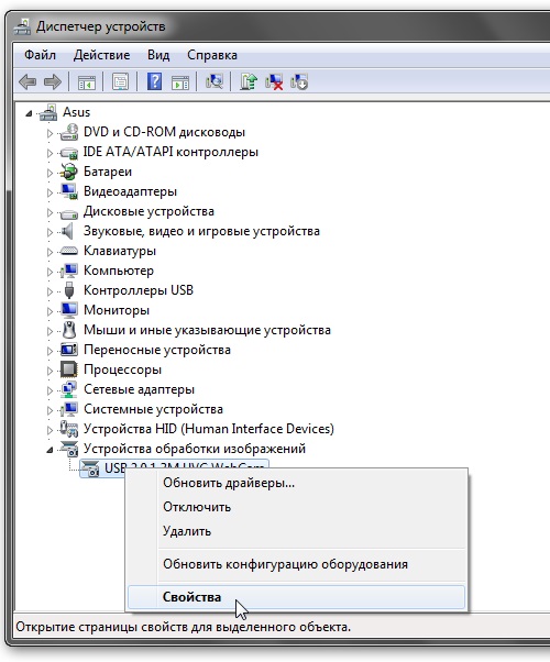 Затем наведите курсор на само устройство, нажмите на правую кнопку и зайдите в «Свойства». Если камера отключена, то включите ее. Как вариант, можно попробовать переустановить драйвера для устройства, которые можно скачать на сайте-производителя ноутбука.