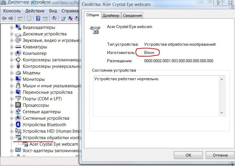 В появившемся окне интересует пункт «Камеры». Также может использоваться название «Устройство обработки изображений». Здесь показаны все использующиеся на переносном компьютере видеокамеры. Дважды нажав левой клавишей мышки на выбранной видеокамере, откроется окно со свойствами.