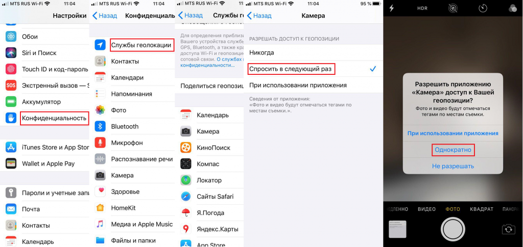 Возможность отключить геолокацию на фотографиях при отправке работает только на отправку и не распространяется на фотографии, которые остаются на iPhone. Это значит, что если вы не отправите снимок в этот раз, то при повторной отправке будет необходимо снова отключить геолокацию.