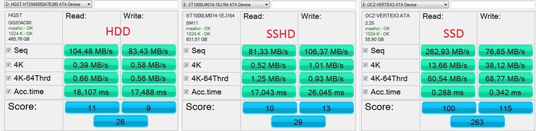 Теперь мы подобрались к самому важному вопросу: насколько SSHD быстрые в сравнении с HDD и SSD?