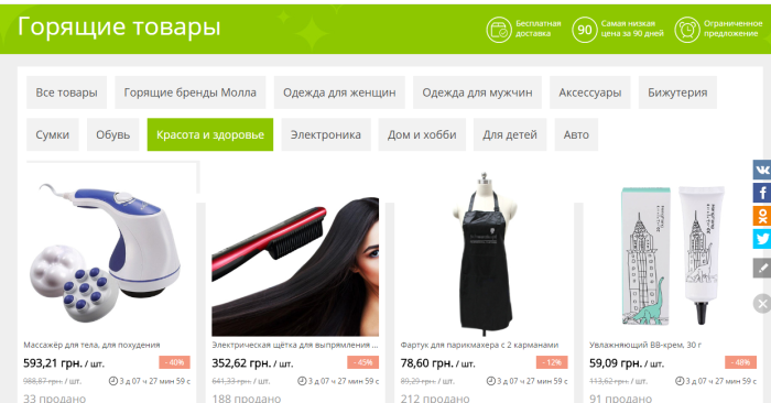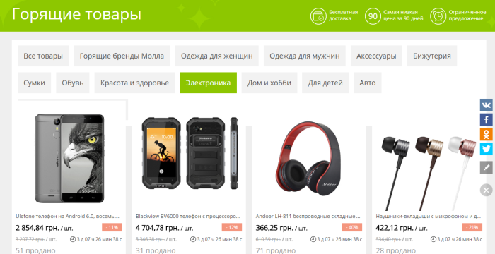 Как и в горящих товарах, в SuperDeals покупки разбиты по следующим группам