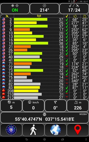 Утилита показывает общее количество «видимых» спутников, уровень сигнала с каждого из них, точность определения координат. Эти данные могут отображаться в виде столбчатой диаграммы или на компасе, при чем компас будет динамически вращаться вместе с вашими перемещениями.