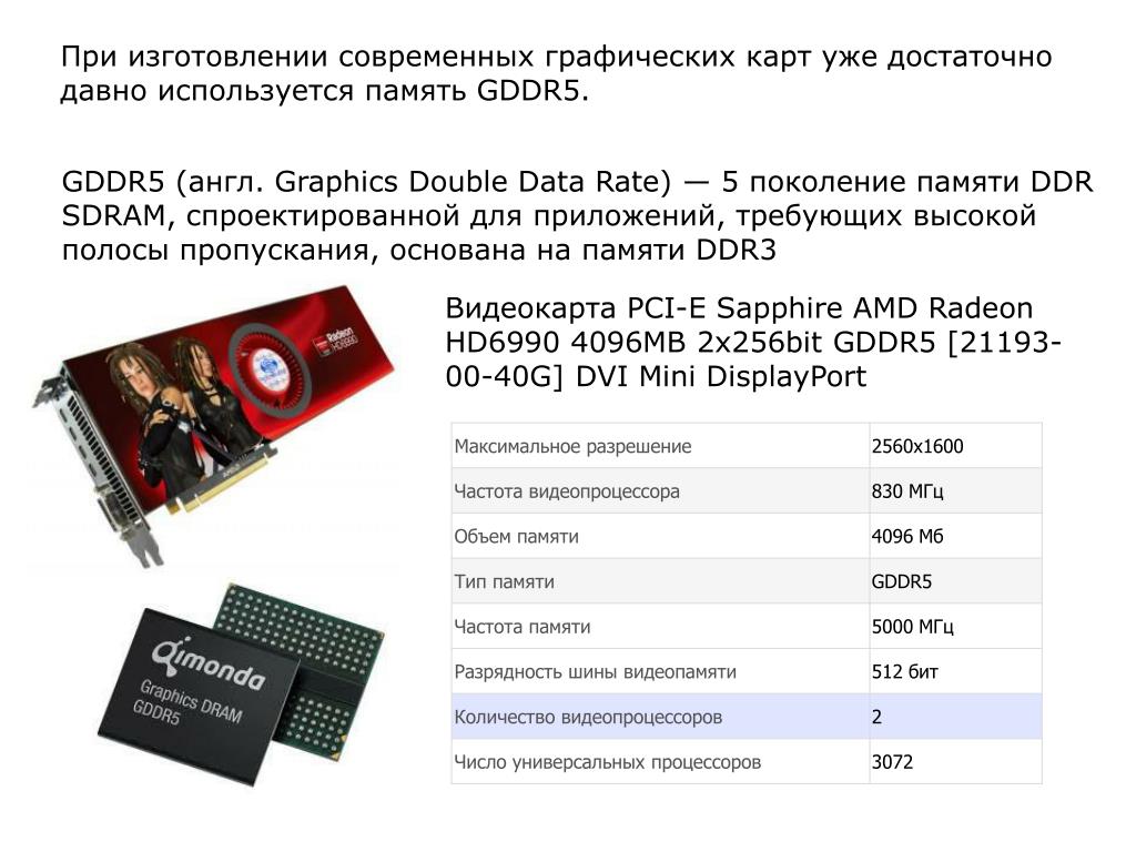 В современных графических ускорителях сейчас используется память GDDR5 (за исключением бюджетных моделей, некоторые из которых все еще работают на DDR3). По сути, это обычная оперативная память, которая есть в любом ПК.