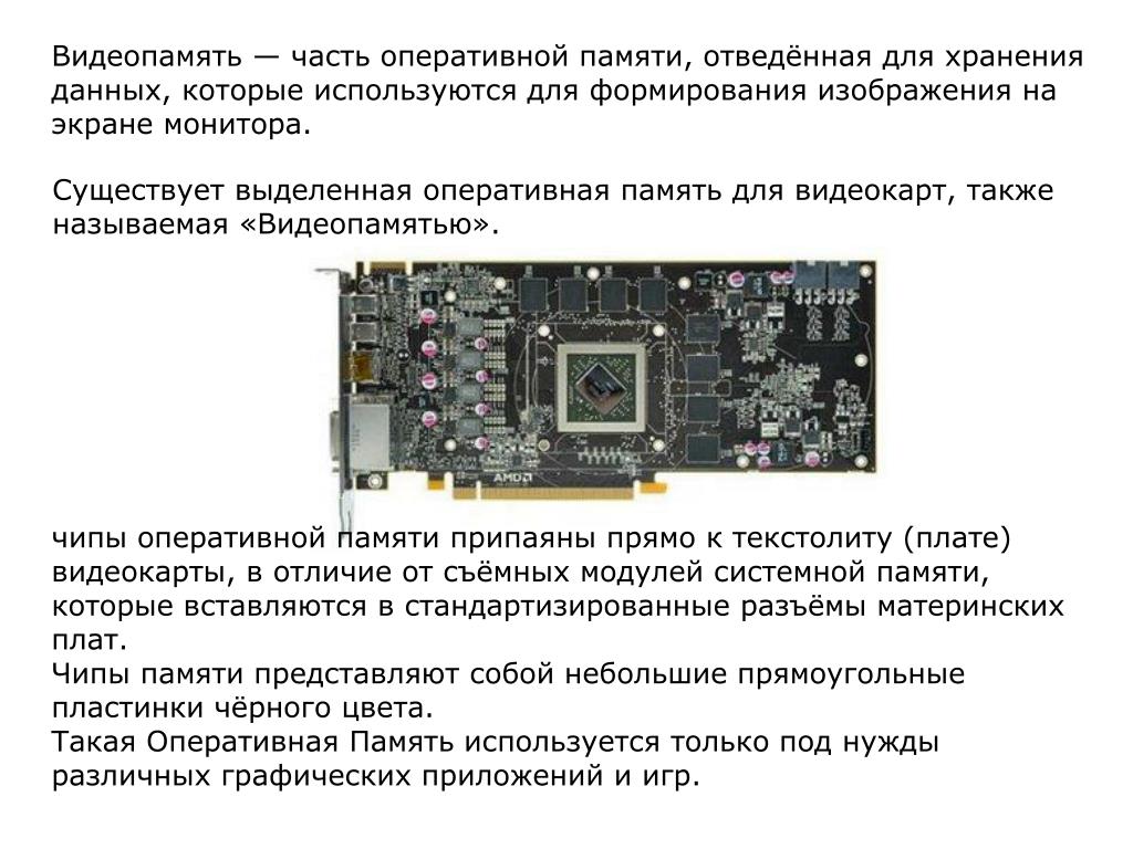 Видеопамять очень похожа на оперативную память основной системы, поскольку она действует как область временного хранения данных. Как правило, производитель видеокарты использует объем видеопамяти, соответствующий мощности карты, но иногда доступно несколько версий. Хотя чем больше оперативной памяти, тем лучше, наличие большего объема оперативной памяти, чем может использовать программное обеспечение, не дает значительных (если вообще дает) преимуществ в производительности. Таким образом, в зависимости от программного обеспечения карты с большим объемом ОЗУ не всегда могут иметь преимущество в производительности по сравнению с картами с меньшим объемом ОЗУ.