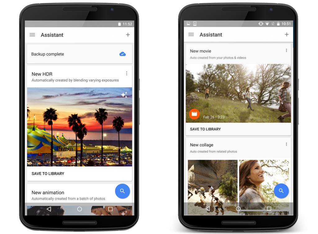 Похвалить новинку стоит за интегрированные базовые настройки редактирования и наличие приятных глазу фильтров. Удачно реализован и продвинутый поиск, на котором акцентировали внимание на презентации. Google Photos находит фотографии конкретных объектов, людей, погоды или мест, но всё ещё справляется лучше с запросами на английском. Неплохо организована и медиатека: по своей структуре она аналогична Photos в iOS и OS X, отличие лишь во вкладке Assistant. Последняя отображает прогресс загрузки фотографий, автоматически сгенерированные истории, анимацию и обработанные снимки.