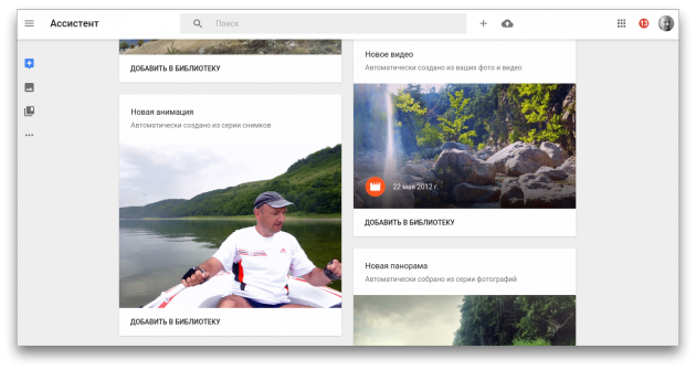 Ещё одна уникальная функция Google Photos, аналогов которой мы не встречали ни в одном фотохостинге. Она заключается в том, что сервис автоматически создаёт из ваших фотографий различные анимации, коллажи, панорамы и фильмы. Созданные программистами Google алгоритмы настолько искусно подбирают подходящие фото, а затем обрабатывают их, что поневоле начинаешь задумываться о перспективах компьютерного интеллекта. Для демонстрации результатов этого цифрового творчества существует специальный раздел «Ассистент», где вы можете просмотреть и сохранить понравившиеся работы.