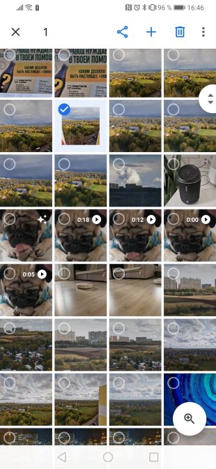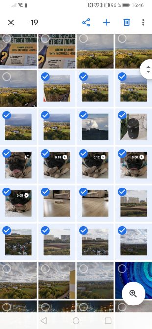 Если нужно быстро выделить несколько десятков снимков, идущих друг за другом, необязательно нажимать на каждое фото. Достаточно зажать одно крайнее и без отрыва пальца провести по всем остальным.
