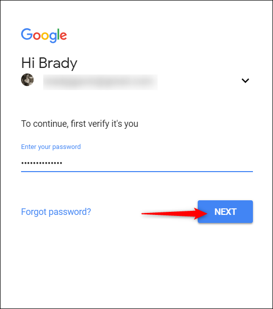 - Введите текущий пароль Gmail и нажмите СЛЕДУЮЩИЙ.