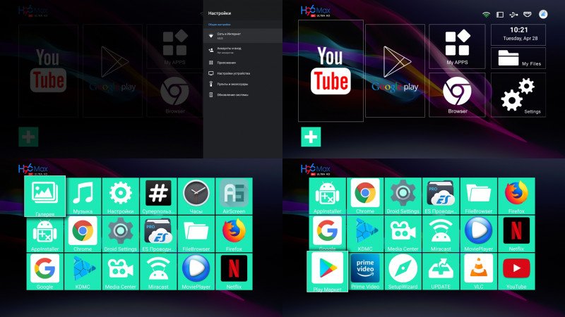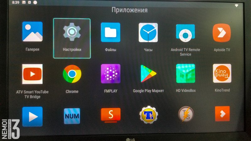 Меню приложений. Изначально, установлено минимальное количество приложений — ТВ центр, Часы, Галерея, Play Store, Chrome, Youtube, Файловый менеджер, настройка сети PPPoE, AppInstaller, Miracast, видеоплеер, Netflix и Facebook.