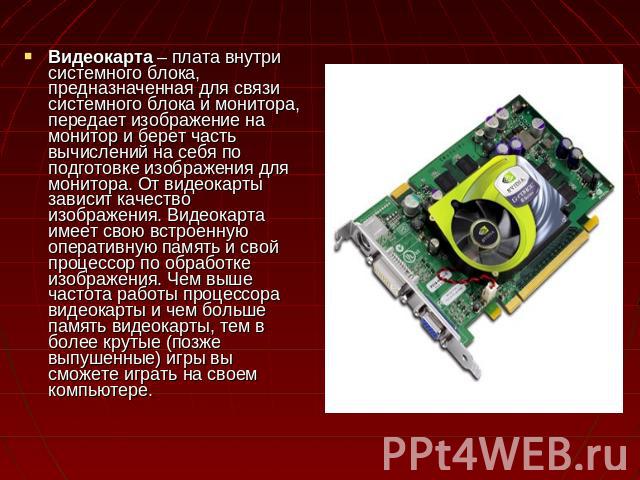 За вывод картинки на монитор, контроля яркости и цветности, формирование трехмерных объектов, накладывание цвета и тени на 3D-объекты отвечает видеокарта.