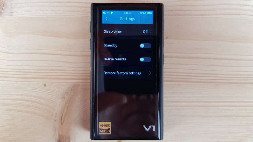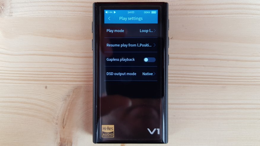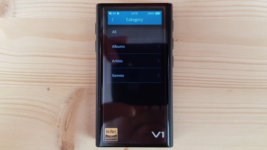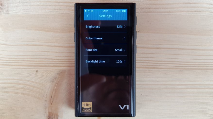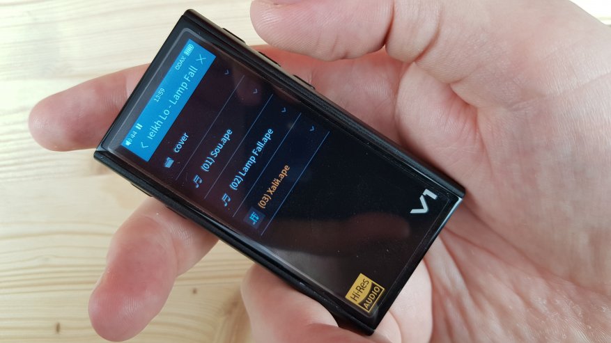 Внешне девайс также ничем не отличается от своего собрата. На передней части находится 2 дюймовый IPS экран, логотип сертификации Hi-Res и наименование серии: V1.