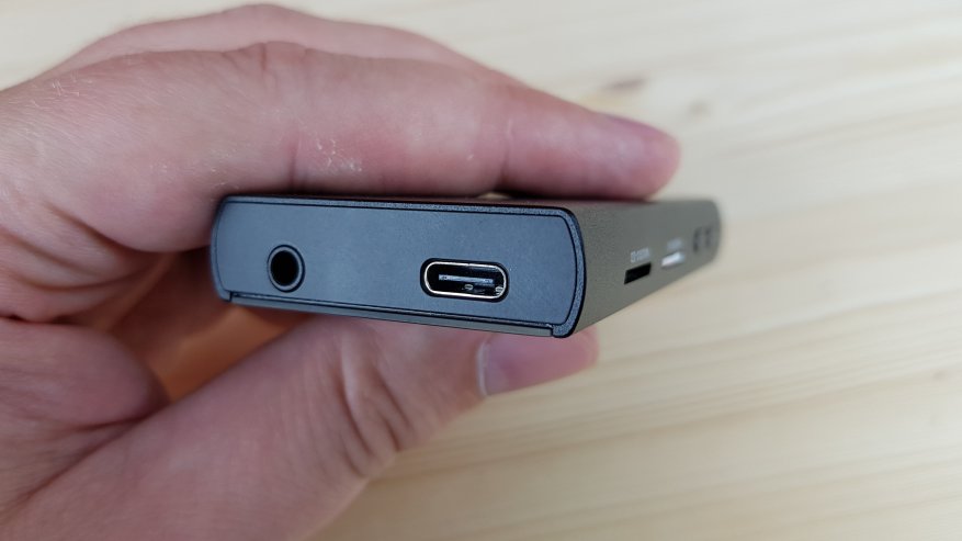 Через Type C происходит зарядка плеера, сюда же можно подключать флешки или жесткие диски, а главное, что именно через этот порт устройство подключается к ПК или смартфону в качестве внешней звуковой карты (USB DAC) и, опять же, именно через него V1-A может работать как цифровой источник с внешним ЦАП. Неслабо так накрутили для одного единственного порта, верно?