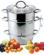Естественно, это прибор для цели изготовления соков. Соковарки в теперешнее время разделяют на два вида: электрические, а также те, которым необходим внешний источник нагревания (как правило, их помещают на варочную поверхность, плиту). Между прочим, варочные поверхности имеют широкую популярность. А вот принцип работы у обоих видов соковарок совершенно одинаковый. Он базируется на воздействии на фрукты пара и выпарки сока из общей массы.Соковарка обычно представлена набором из нескольких ёмкостей, которые размещаются одна над другой. Именно в нижнюю ёмкость помещается водичка, затем ёмкость располагают на плите и доводят водичку до состояния кипения. Затем ставят на неё ёмкость для скопления сока (у подобной ёмкости имеется специально предназначенная трубка с зажимом для сливания сока), сверху нее помещают дуршлаг с наличием продуктов