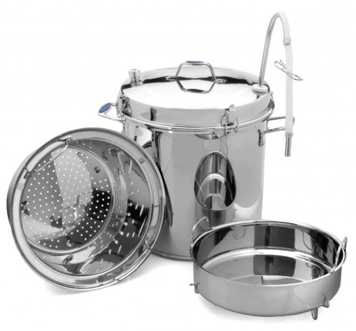 Материал — соковарки производят из алюминия и нержавеющей стали. У каждого из них есть свои плюсы. К примеру, алюминиевая соковарка имеет лёгкий вес. При этом подобный прибор нельзя ставить на индукционную плиту. Нержавеющая сталь более универсальна. К тому же она легко отмывается. Несмотря на то, что алюминиевая посуда дешевле, стальная всё же дольше служит на кухне. Так что если Вы планируете много готовить, то стоит выбрать соковарку из нержавеющей стали.