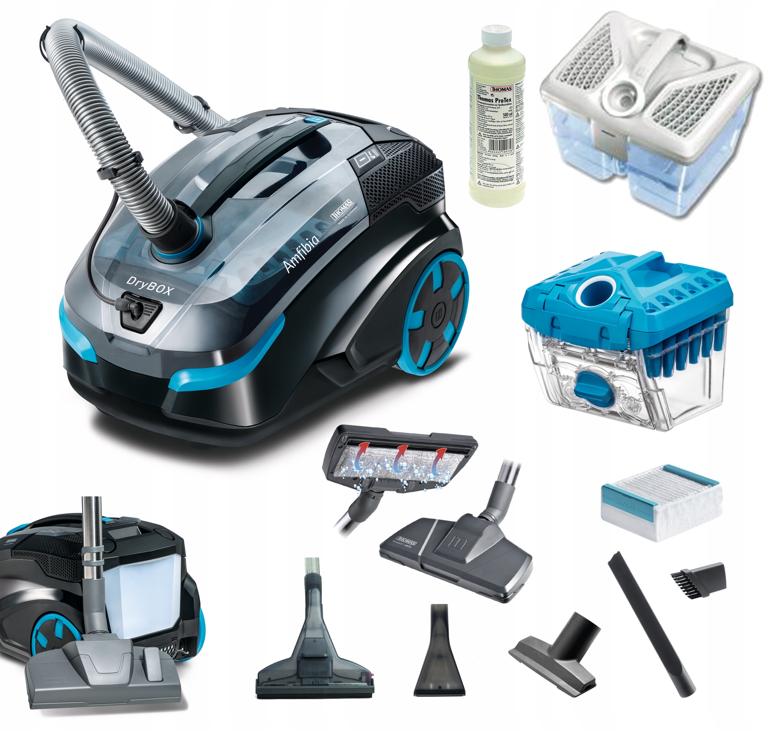 • Thomas Amfibia Family, о ней писали выше. Многофункциональная модель для влажной и сухой уборки, кроме AquaBox в комплекте идет DryBox для быстрой сухой уборки.