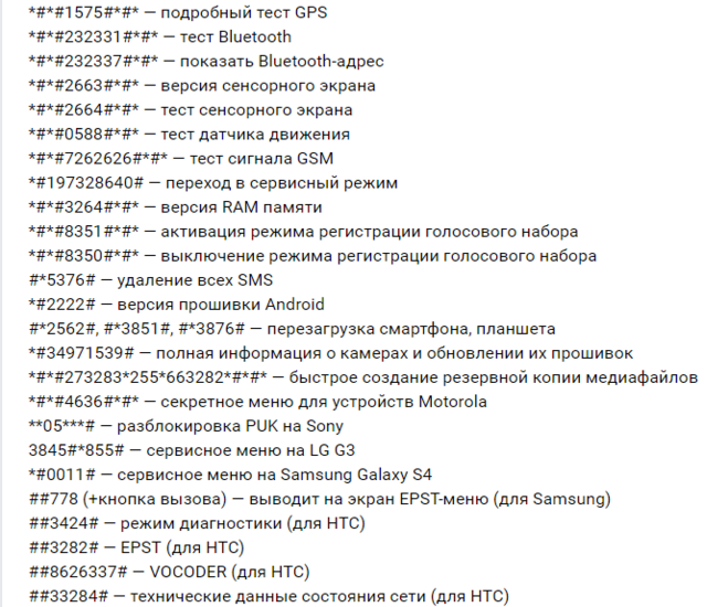 В зависимости от модели мобильного устройства, код доступа инженерного меню может отличаться. Ниже приведены примеры самых распространенных команд для того, чтобы войти в заветный раздел.