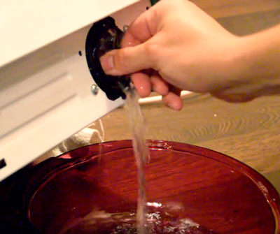 Если такая неприятность произошла, следует подготовить ёмкость для воды и открыть дверцу или панель, обычно она находится справа внизу (реже слева внизу). Если есть шланг аварийного слива, следует слить воду через него. Если шланга нет, открутите сливной фильтр, предварительно подставив приготовленную ёмкость. Вода сольётся, а засор фильтра следует удалить, промыв его под проточной водой.