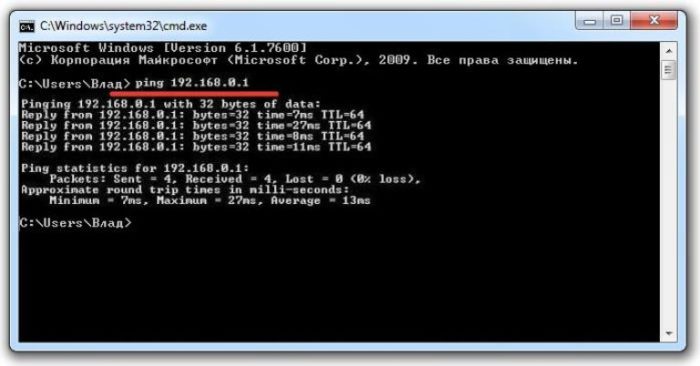 Вводим в окне «ping 192.168.0.1», нажимаем «Enter»