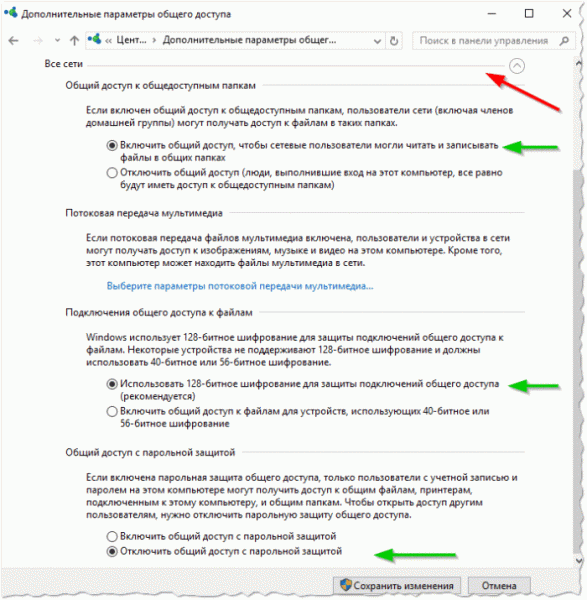 Раскрываем все сетевые профили в выпадающем списке, включаем все разрешения на обнаружение, доступ и управление ПК