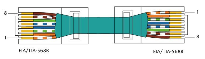 В прямом кабеле соединения (распиновка) контактов на обоих его концах одинаковы (1-1 2-2 и т.д.). Такой тип кабеля используется для передачи, но не для обмена данными между устройствами.