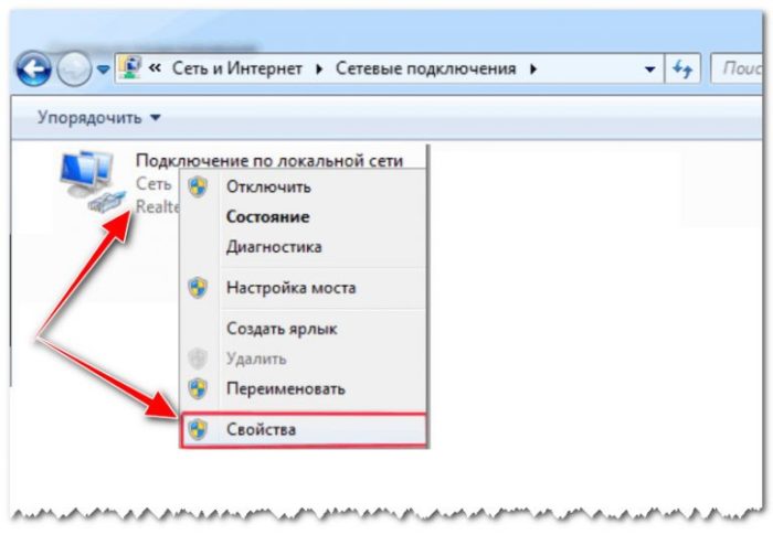 Щелкаем на «Подключение по сети…», выбираем «Свойства»