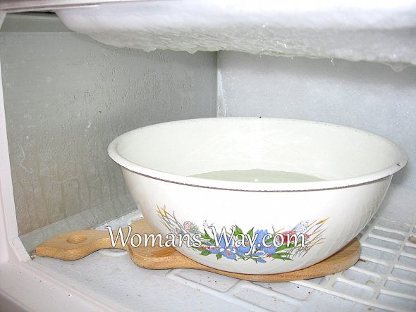 Миска с кипятком не должна касаться стенок морозилки. Дверцу можно прикрыть, чтобы тепло максимально воздействовало на нашей обледенелости.