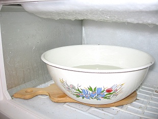 Возьмите несколько глубоких керамических мисок объёмом от 1,5 литров и более. Налейте в каждую из них крутой кипяток, после чего расположите на полки. Можно заменить керамику обыкновенными алюминиевыми кастрюлями, но вода в них будет остывать гораздо быстрее, это вам ни к чему. Сам процесс оттаивания достаточно прост: горячие пары активно воздействуют на замороженную массу, в результате чего последняя начинает таить с удвоенной скоростью. По желанию можно заменить ёмкости с кипятком обыкновенной грелкой, она действует по тому же принципу, но результат достигается дольше.