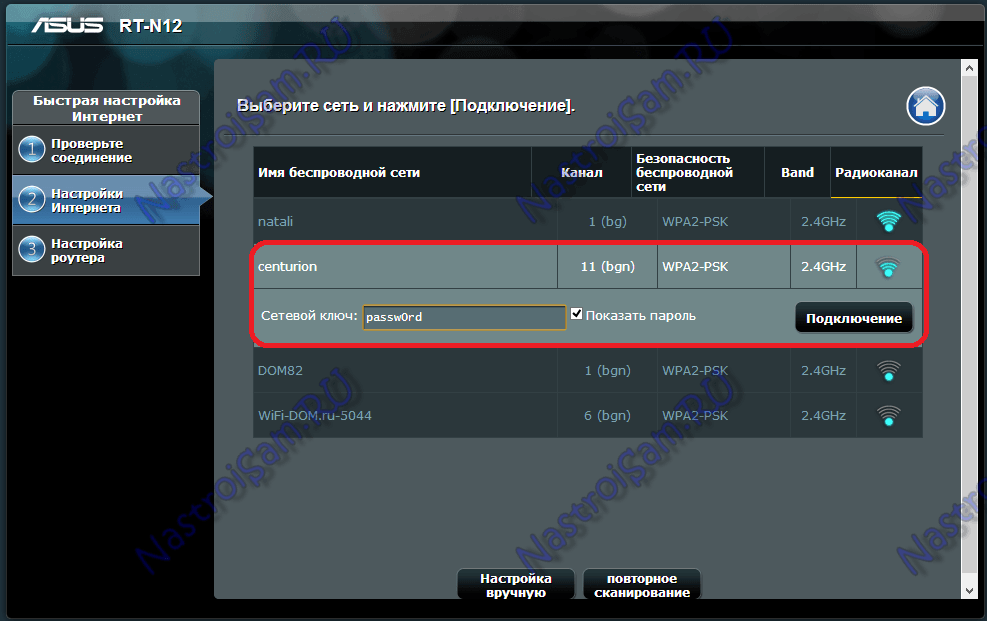 Это список доступных беспроводных сетей. Вам нужно найти имеющуюся сеть, ввести ключ сети (пароль) и нажать кнопку «Подключение». После этого Asus должен подключиться к сети, получить адрес и расширить зону покрытия.