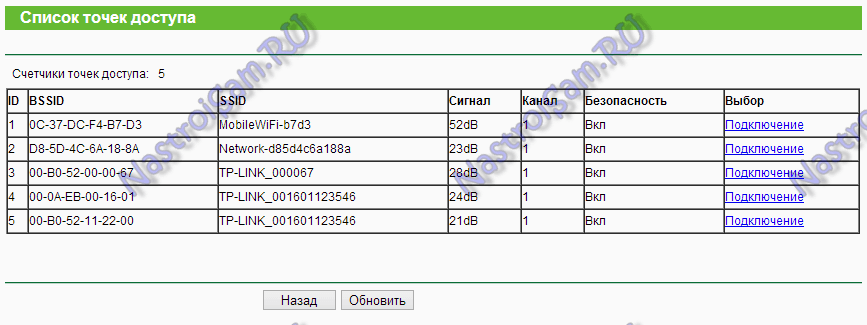 Находим среди них свою и нажимаем кнопку «Подключение». После этого Вы попадете назад, в настройки Wi-Fi, где Вам нужно будет ввести пароль к сети и нажать кнопку Сохранить. После этого, TP-Link подключиться ко второй точке доступа как повторитель и расширит её зону покрытия беспроводной сети.