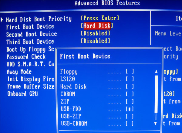 Теперь нужно полностью выключить ваш ПК, вставить дискету на место и снова включить компьютер. В том случае, если в BIOS прописана опция загрузки системы с жёсткого диска, следует изменить её на загрузку с гибкого магнитного диска. Для этого непосредственно перед загрузкой системы нажмите кнопку «Del», что позволит зайти в BIOS. Далее следует открыть пункт «Advanced BIOS Features», в котором отобразится несколько подпунктов. В данном меню помимо дискеты и CD может быть несколько разделов с жёсткими дисками. Это вызвано тем, что жесткие диски для ПК могут быть установлены в компьютере в количестве двух или более штук. Нам нужен пункт «First Boot Device». При помощи клавиш «PgDn» и «PgUp» следует на первое место установить строку «Floppy». Теперь закройте окно клавишей «Esc» и выйдите из BIOS с сохранением данных, нажав кнопку «F10».