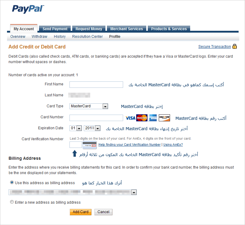 - Заполните пустые поля, а именно тип и номер карточки, 0срок действия и ее CVV, введите правильный адрес.