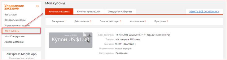Посмотреть спецкупоны можно в личном кабинете. Откройте раздел «Мой Алиэкспресс» и найдите там подраздел «Мои купоны». Затем найдите вверху графу «Мои спецкупоны». В этом разделе отображаются все спецкупоны: действительные, недействительные, использованные и просроченные. Помимо списка всех купонов которые у вас есть, рядом с каждым вы найдете срок действия, магазин и статус спецкупона. Если купоны не будут использованы в течение срока, указанного в условиях, они сгорят.