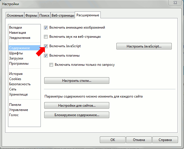 - Выберите панель Безопасность и убедитесь, что рядом с элементом Разрешить JavaScript установлен флажок.