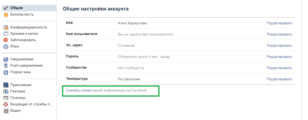 Теперь пошагово о том, как поменять имя в Фейсбуке. Для этого необходимо зайти в раздел «Настройки» (в верхнем правом углу нажимаете стрелочку вниз и выбираете из открывшегося списка строку «Настройки»). Затем слева выбираете вкладку «Общие». Так вы попадаете на страницу, где можно редактировать имя и «имя пользователя Facebook» (отображается в строке браузера при открытии вашего профиля). Нажимаете «Редактировать», после чего пишете имя и фамилию и нажимаете «Проверить изменения».