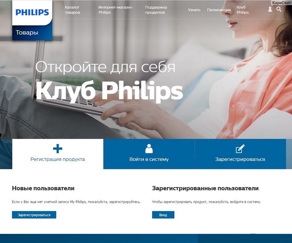 - Нажмите на кнопку входа в личный кабинет Philips, затем введите имя и код доступа.