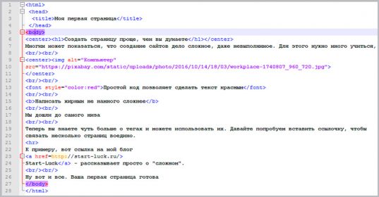 <html> <head> <title>Моя первая страница</title> </head> <body> <center><h2>Создать страницу проще, чем вы думаете</h2></center> Многим может показаться, что создание сайтов дело сложное, даже невыполнимое. Для этого нужно много учиться, узнать, сделать. На самом деле существует около 100 тегов, которые даже не обязательно учить. Важно лишь понять, что и где применяется. Информацию можно подсмотреть в различных шпаргалках, а со временем вы начнете вспоминать теги на автомате. <br/><br/> <center></center> <br/><br/> <font>Простой код позволяет сделать текст красным</font> <br/><br/> <b>Написать жирным не намного сложнее</b> <br/><br/> Мы дошли до самого низа <br/><br/> Теперь вы знаете чуть больше о тегах и можете использовать их. Давайте попробуем вставить ссылочку, чтобы связать несколько страниц воедино. <br/><br/> <hr> К примеру, вот ссылка на мой блог — <a href=»https://start-luck.ru/»>Start-Luck</a> — рассказывает просто о «сложном». <br/><br/> Ну вот и все. Ваша первая страница готова <br/><br/> </body> </html>