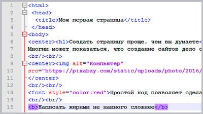 <html> <head> <title>Моя первая страница</title> </head> <body> <center><h2>Создать страницу проще, чем вы думаете</h2></center> Многим может показаться, что создание сайтов дело сложное, даже невыполнимое. Для этого нужно много учиться, узнать, сделать. На самом деле существует около 100 тегов, которые даже не обязательно учить. Важно лишь понять, что и где применяется. Информацию можно подсмотреть в различных шпаргалках, а со временем вы начнете вспоминать теги на автомате. <br/><br/> <center></center> <br/><br/> <font>Простой код позволяет сделать текст красным</font> <br/><br/> <b>Написать жирным не намного сложнее</b> <br/><br/> Мы дошли до самого низа <br/><br/> Теперь вы знаете чуть больше о тегах и можете использовать их. Давайте попробуем вставить ссылочку, чтобы связать несколько страниц воедино. <br/><br/> <hr> К примеру, вот ссылка на мой блог - <a href="https://start-luck.ru/">Start-Luck</a> - рассказывает просто о "сложном". <br/><br/> Ну вот и все. Ваша первая страница готова <br/><br/> </body> </html> |
