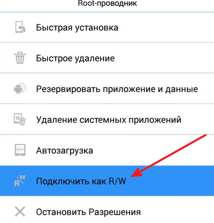 В результате появится запрос на предоставление рут-прав. Нажмите «ОК», чтобы предоставить приложению права root. А после предоставления рут-прав еще раз нажмите на пункт меню «Route Explorer» и не отпускайте палец, пока на экране не появится меню с дополнительными настройками. В этом окне нужно выбрать «Подключить как R / W».