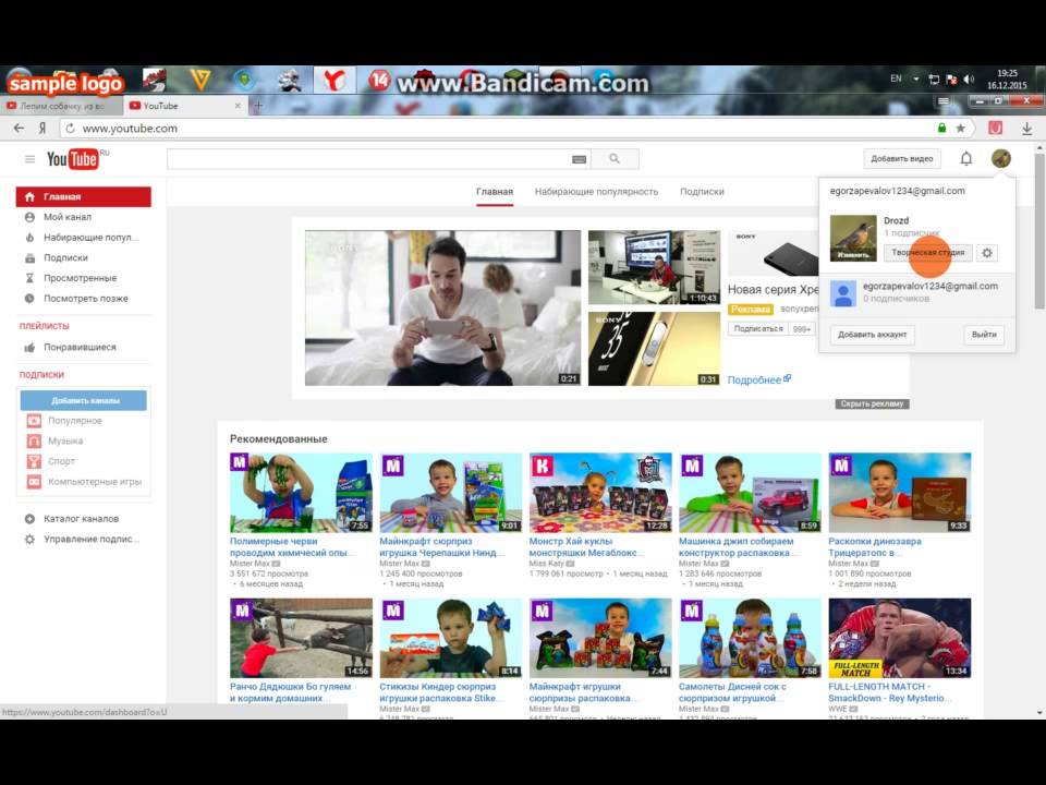 Все очень просто, как всегда заходите на свой канал . В правом верхнем углу нажмите на свою аватарку и выберите надпись ТВОРЧЕСКАЯ СТУДИЯ.