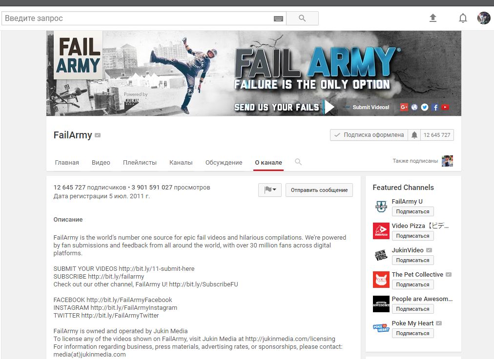 Ниже названия канала найдите вкладку О КАНАЛЕ.
