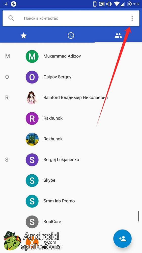 - Посетите в контактах раздел «Настройки». Они находятся в верхнем правом углу в виде трех точек.
