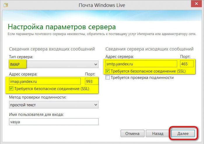 | Рис. 314. Настройка почтового ящика на сервисе Яндекс |