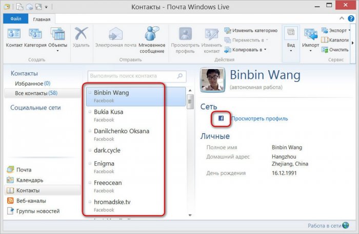 Помимо этого, при подключении к «Почте Windows Live» учётной записи Microsoft в раздел контактов автоматически добавляются синхронизированные до этого данные (контакты Facebook, Skype, Твиттер, прочих сервисов), в частности, к которым пользователь предоставлял доступ, работая с приложениями Metro-интерфейса Windows 8/8.1.