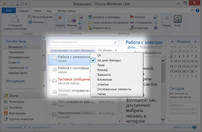 Список электронных писем в папках можно выстраивать по различным параметрам — дате получения, теме, вложениям, размеру и т.п. Одной из ключевых особенностей «Почты Windows Live» считается функция упорядочивания электронных писем по типу бесед. Чтобы долго не искать нужное письмо, ответ на него, отталкивающиеся от них сообщения, достаточно просто включить режим отображения в виде бесед. И все письма, на которые уже отправлен ответ, будут автоматически располагаться в одном списке с полученными письмами.