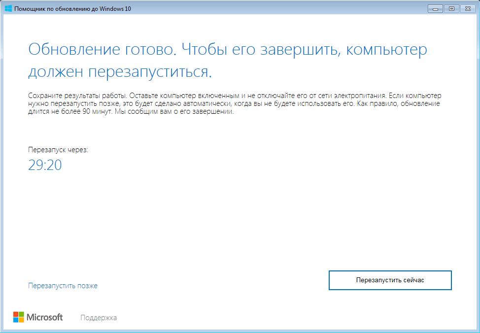 И наконец, откроется последнее окно, где предлагается установить обновление сейчас или сделать это спустя некоторое время. На этом этапе проверьте закрыты ли все важные документы, чтобы не потерять их. Если что-то нужно доделать – отложите загрузку, если же все нормально, то выбираем установку сейчас.