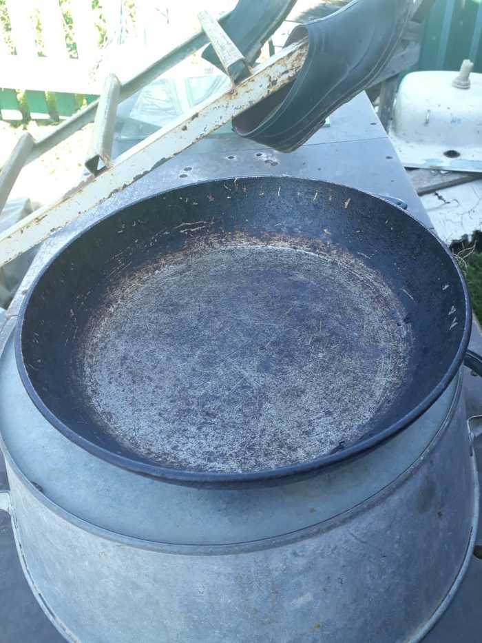 Казан и другую глубокую чугунную посуду прокаливают так же, как и сковороду. Однако, если казан не имеет плоского дна, а в духовке не помещается, то в домашних условиях, сделать это не получится – придётся воспользоваться специальной газовой горелкой под казан или выполнять процедуру на костре. В этом случае можно обойтись и без соли — огонь сделает своё дело: выжжет все технические смазки. Если всё же делаете это на плите или в духовке, то важно помнить, что соли необходимо много, 3-4 кг.